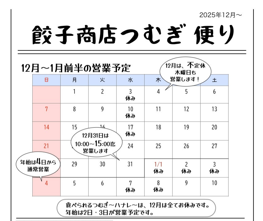 ・12月は全て〈本店工房〉のみの営業となり、(木)も営業します。